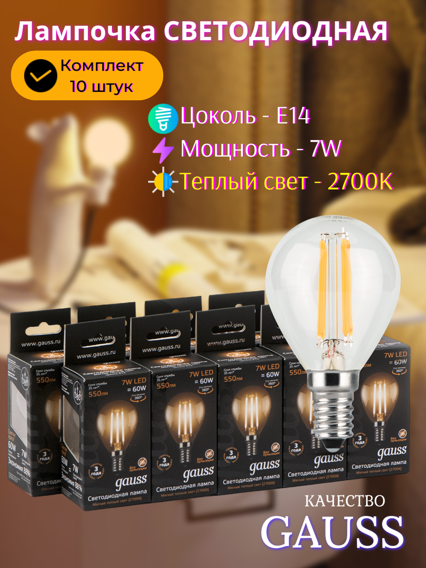 Купить Лампочка светодиодная E14 Шар 7W теплый свет 2700K упаковка 10 шт. Gauss Filament