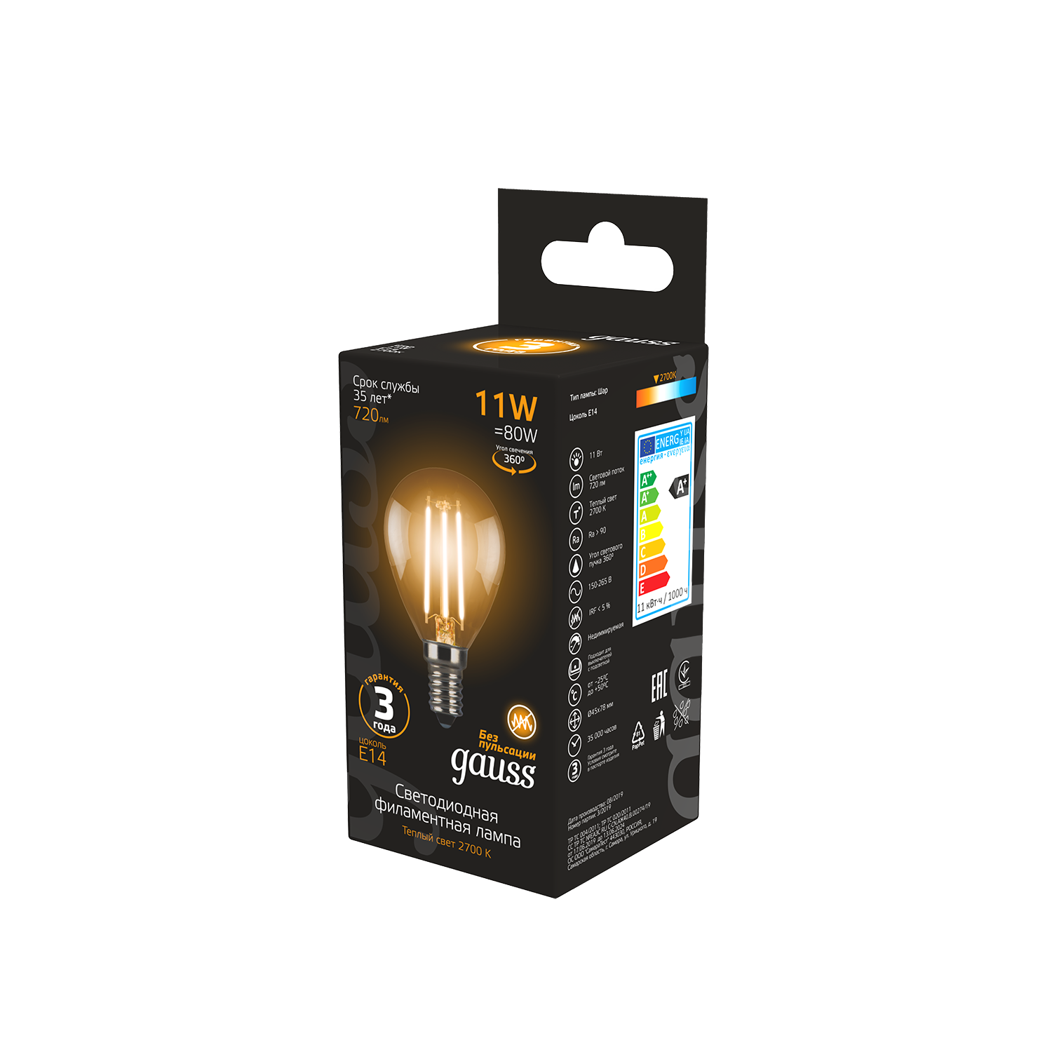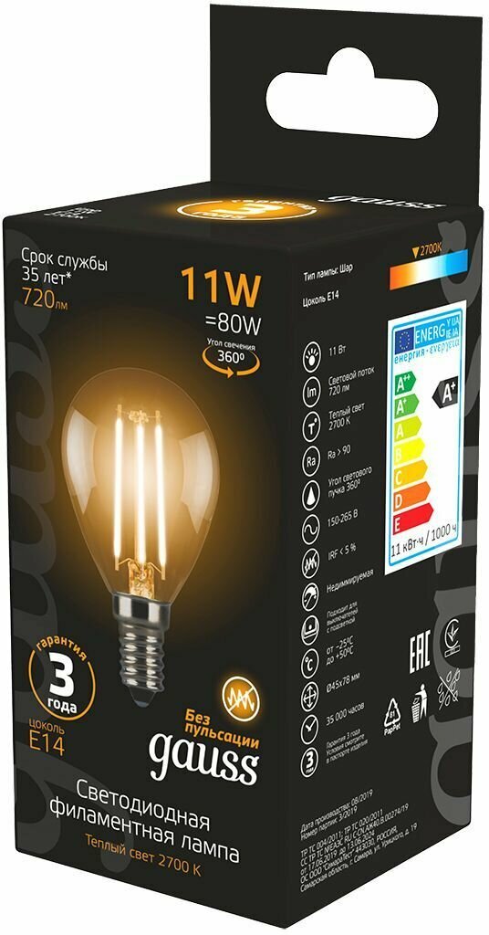 Купить Лампочка светодиодная Е14 Шар 11W теплый свет 2700K упаковка 10 шт. Gauss Filament