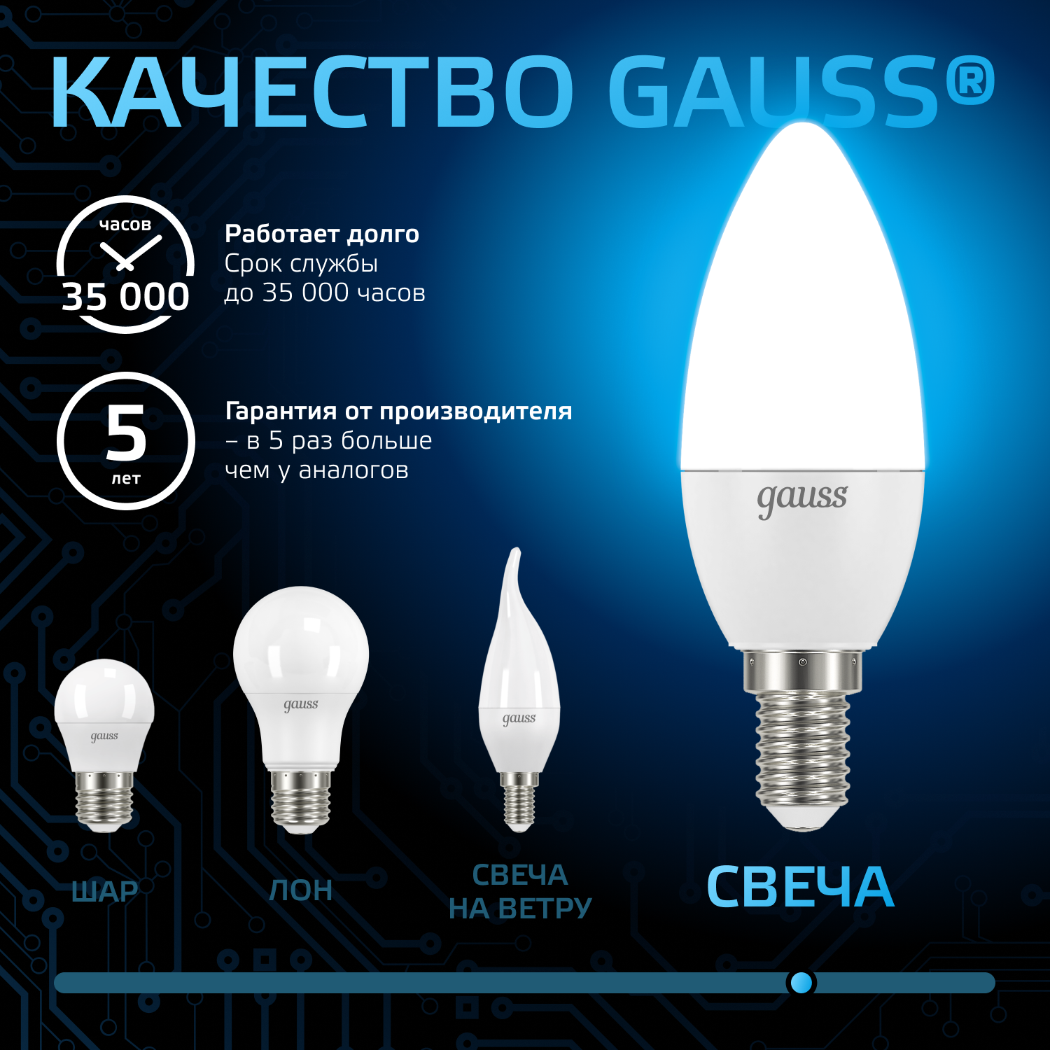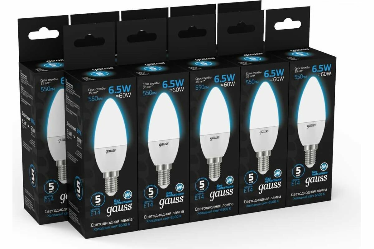 Купить Лампочка светодиодная Е14 Свеча 6.5W холодный белый свет 6500К упаковка 10 шт. Gauss Black