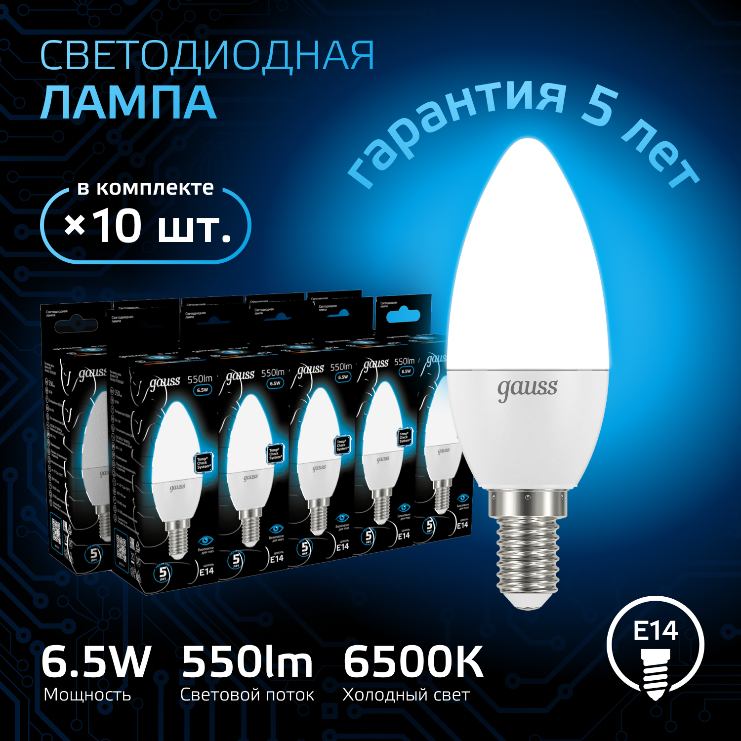 Упаковка ламп LED GAUSS E14, свеча, 6.5Вт, 103101307, 10 шт.