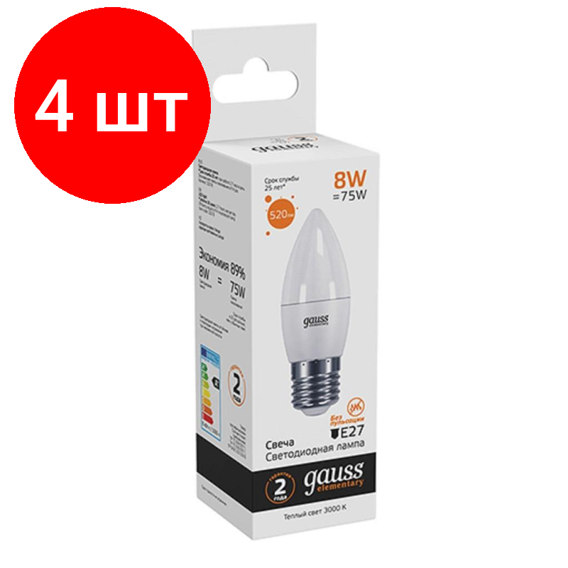 Купить Комплект 4 штук, Лампа светодиодная Gauss LED Elementary Свеча 8Вт E27 520Лм 3000K (33218)