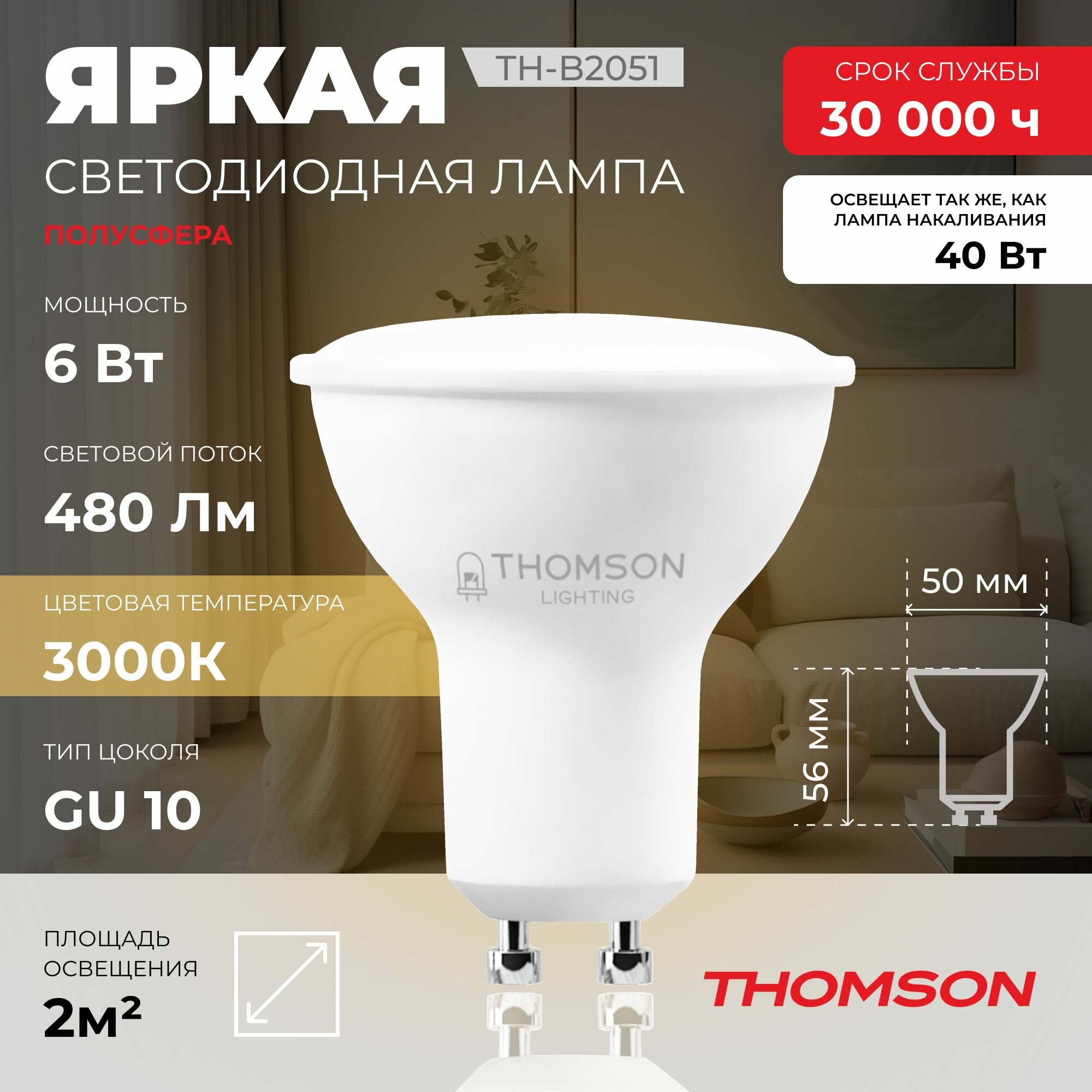 Лампа LED Thomson GU10, полусфера, 10Вт, 3000К, белый теплый, TH-B2055, одна шт.