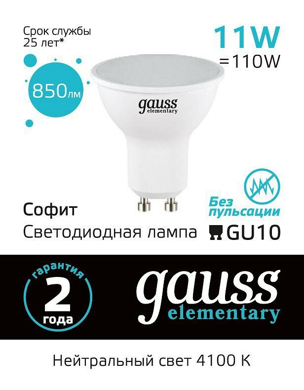 Купить Gauss Elementary MR16 GU10 11W(850lm) 4100K 4K 56x50 матов., пластик 13621
