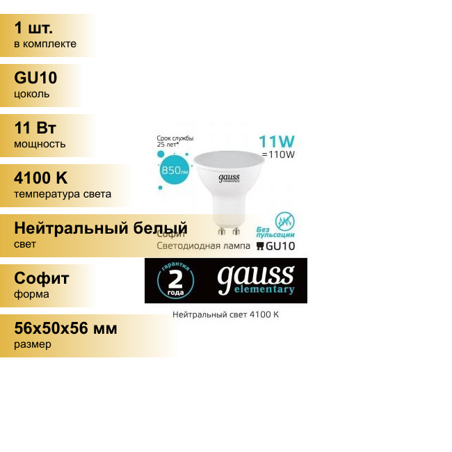 Лампочка светодиодная Gauss Elementary 11В эквивалент 110В 4100K 850Лм GU10 для спотов MR16 13621 (комплект из 2 шт.)