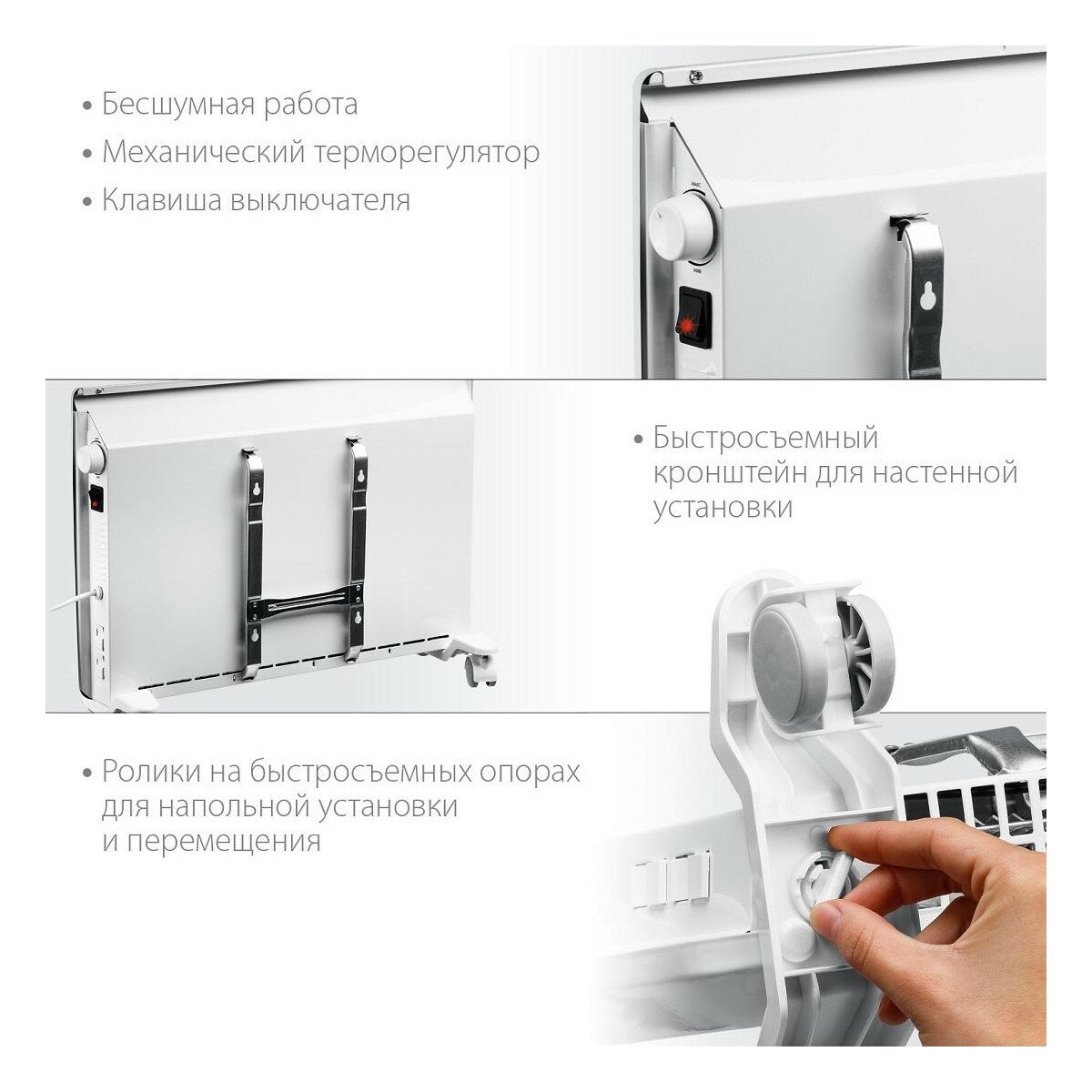 | Подробная комплектация | конвектор электрический 1 шт, кронштейн 1 шт, ролик 4 шт, опора 2 шт, набор крепежа 1 шт, руководство по эксплуатации 1 шт |