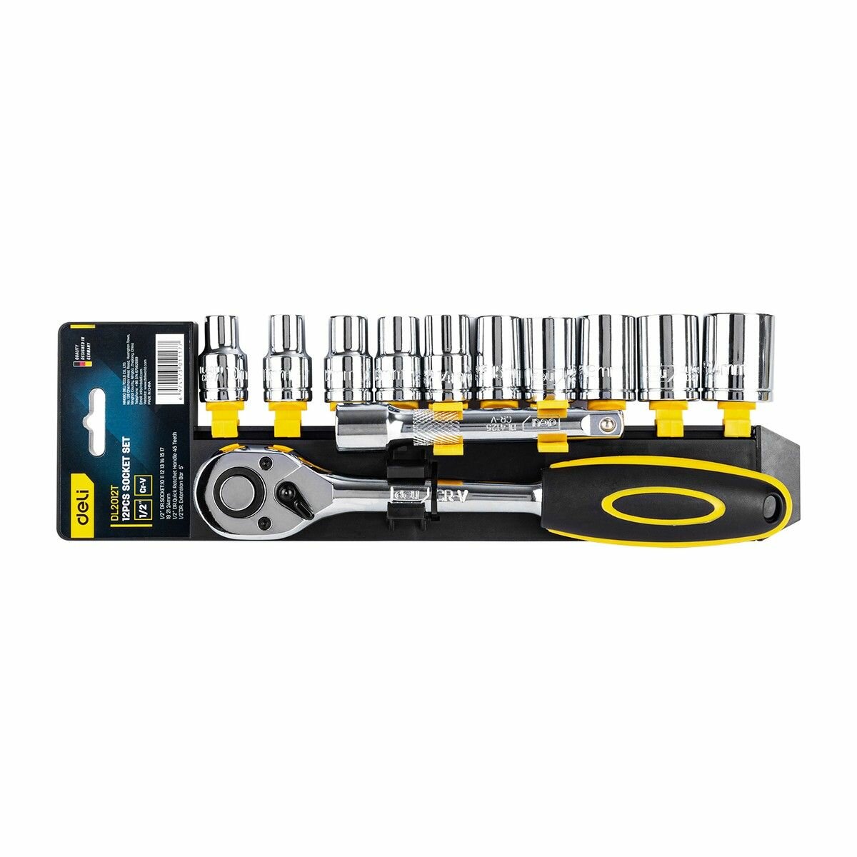 Набор торцевых ключей 12 шт Deli Dl2012t 1/2"; Материал: 50BV30. В набор инструментов входят: Головк