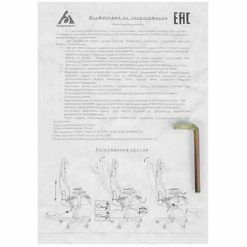 | Регулировка | высоты подлокотников / высоты поясничного упора / глубины сиденья / жесткости качания / наклона спинки / угла подлокотников |