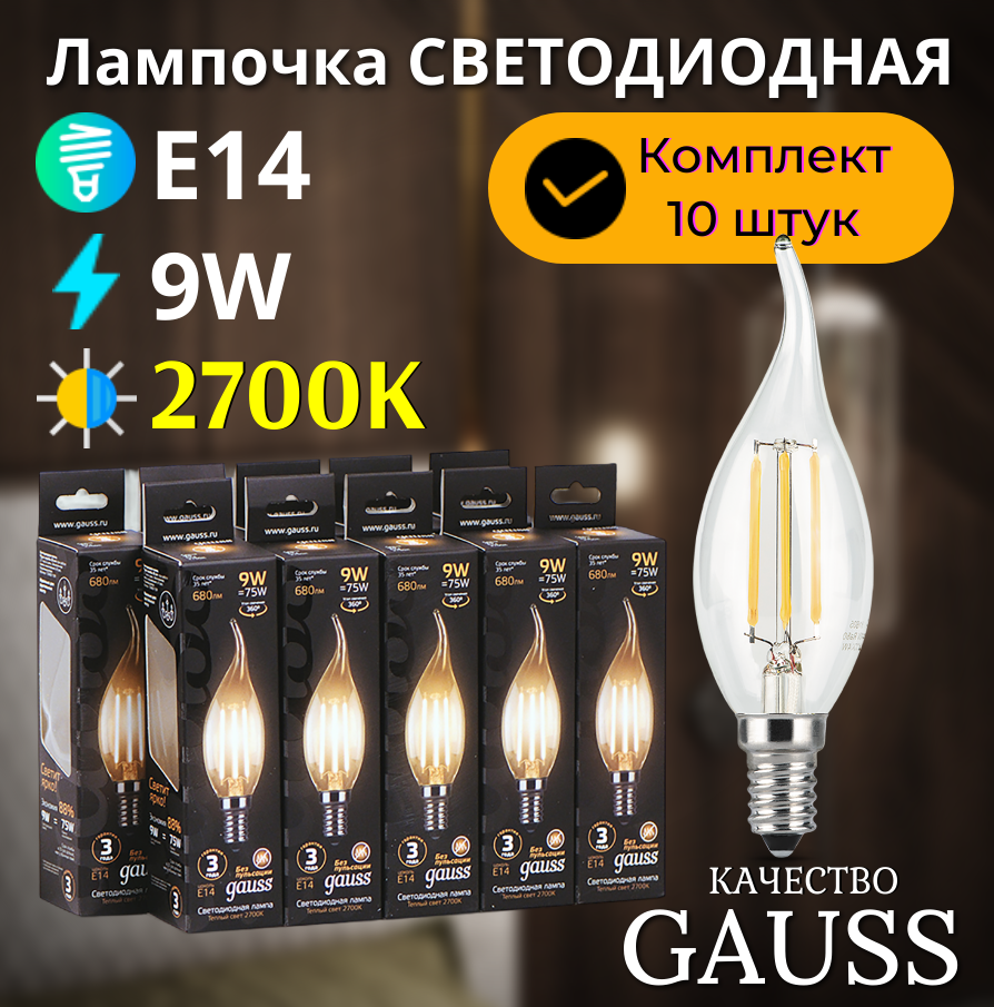 Купить Лампочка светодиодная E14 свеча на ветру 9W теплый свет 2700K упаковка 10 шт. Gauss Filament