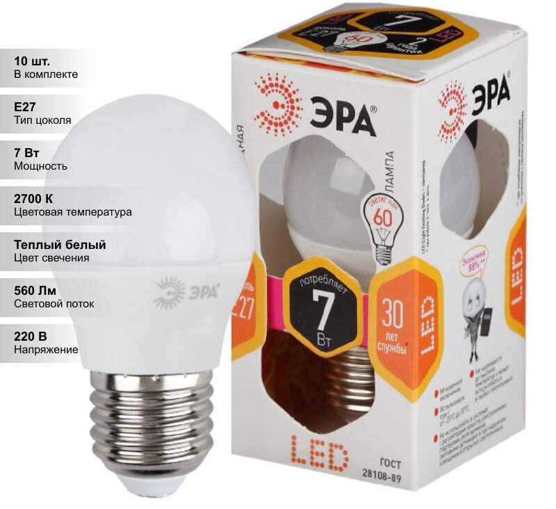 ЭРА LED P45-7W-827-E27 (диод, шар, 7Вт, тепл, E27)