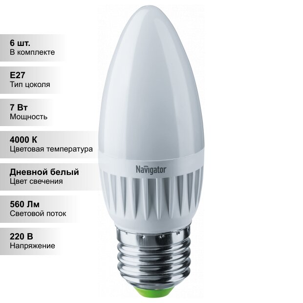 Купить (6 шт.) Светодиодная лампочка Navigator C37 7Вт 230В 4000K E27