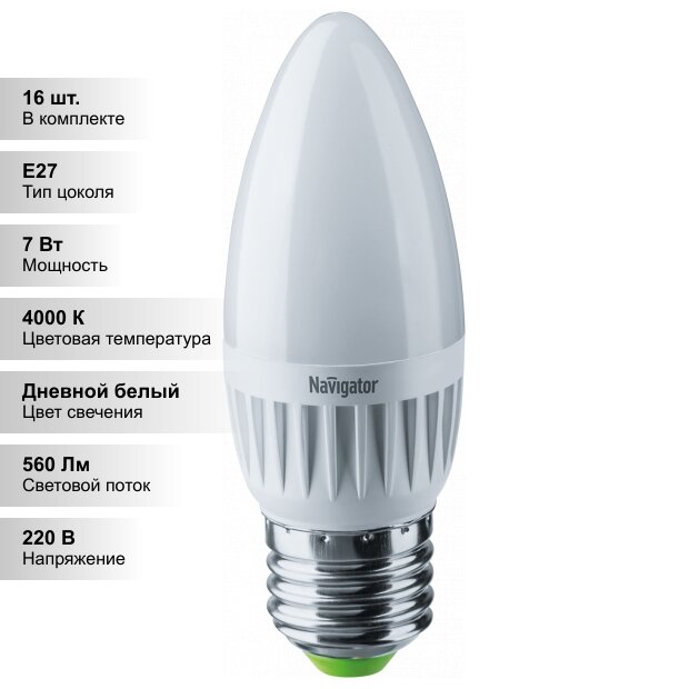 Ниже Вы можете прочитать отзывы на (16 шт.) Светодиодная лампочка Navigator C37 7Вт 230В 4000K E27, ознакомится с подробными характеристиками, посмотреть интересные обзоры и фотографии на (16 шт.) Светодиодная лампочка Navigator C37 7Вт 230В 4000K E27.