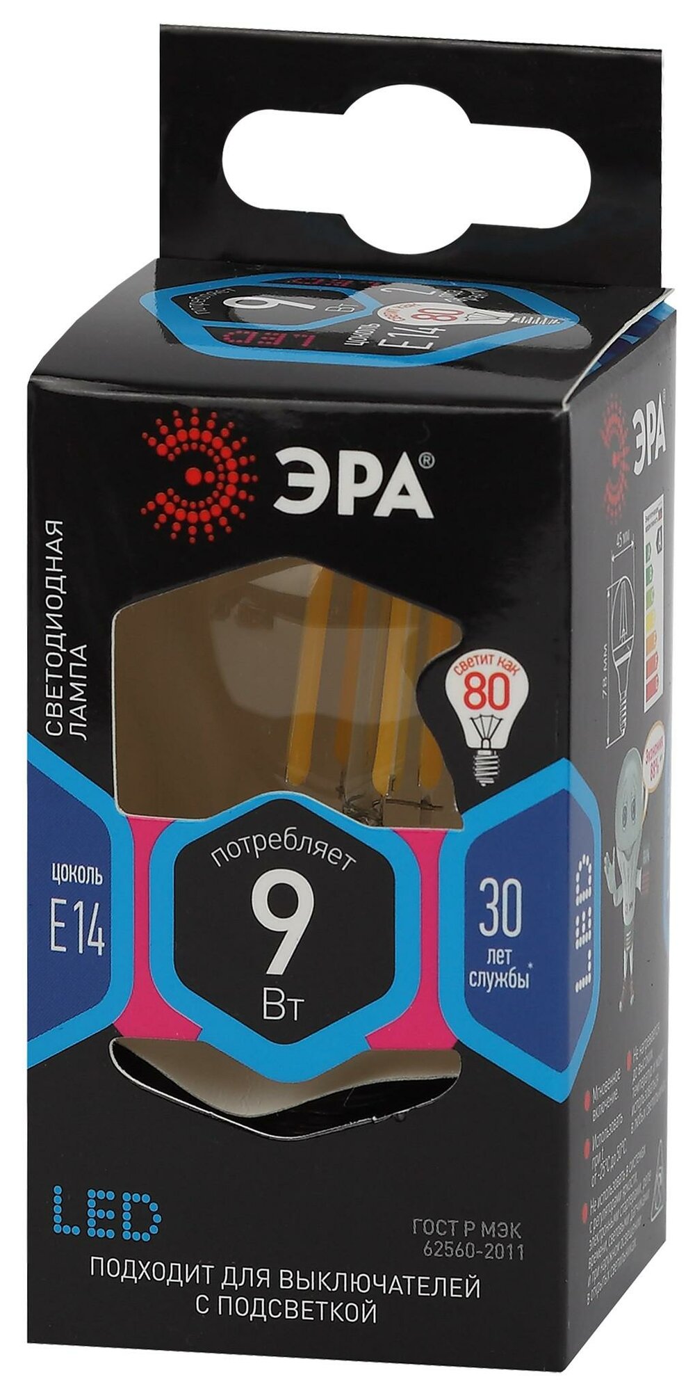 ЭРА F-LED P45-9w-827-E14 ЭРА (филамент, шар, 9Вт, тепл, E14) (10/100/4000)