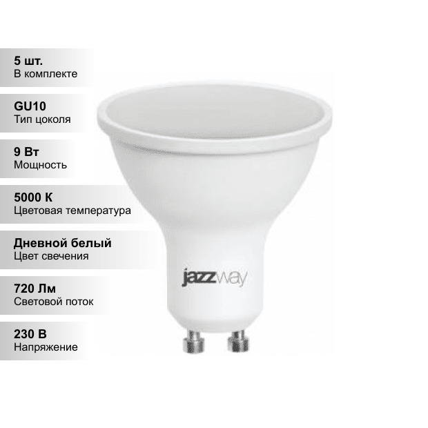 Купить (5 шт.) Светодиодная лампочка Jazzway 9Вт 230В 5000K GU10