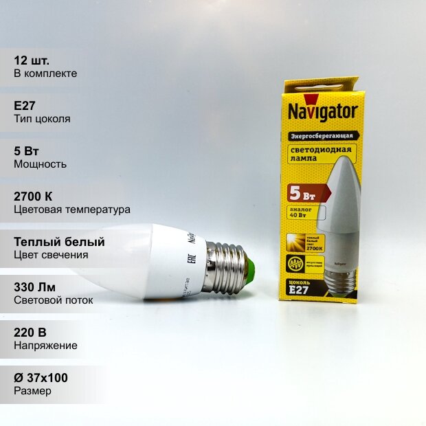 Купить (12 шт.) Светодиодная лампочка Navigator C37 свеча, мощность 5Вт, напряжение питания 230В, цветовая температура 2700K, теплый белый свет, цоколь E27, размер 37х100 мм, NLL-P-C37-5-230-2.7K-E27-FR