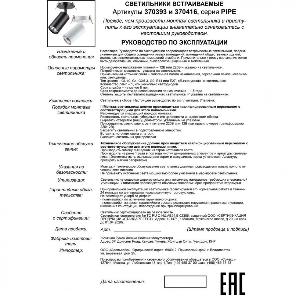 Встраиваемый белый 370393 светильник IP20 GU10 50W 220V PIPE