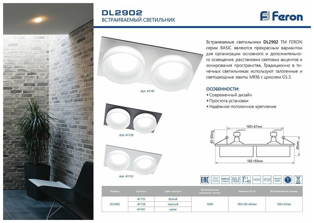 СохранитьFERON Светильник потолочный встраиваемый, MR16 G5.3, хром DL2902 41141 интересное: