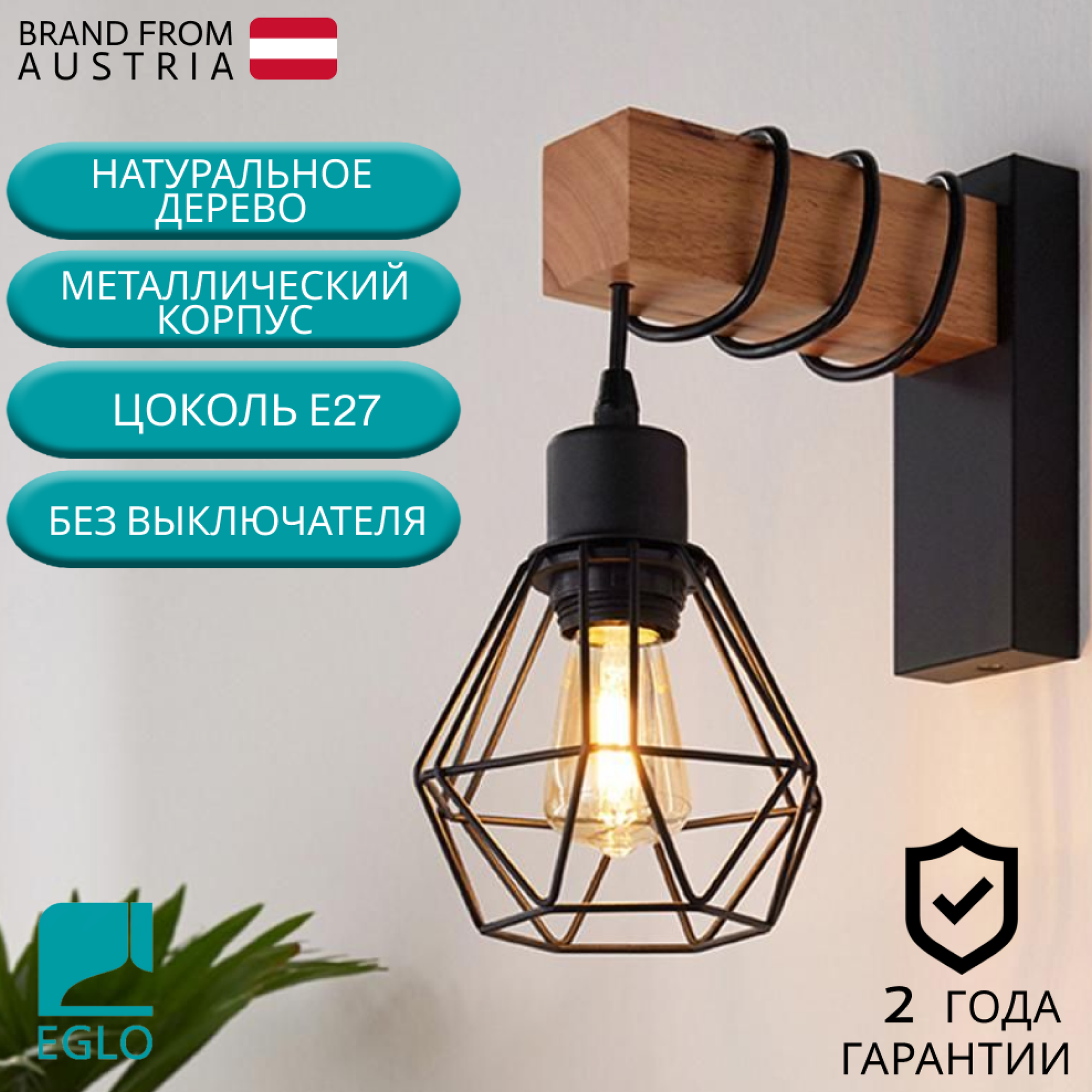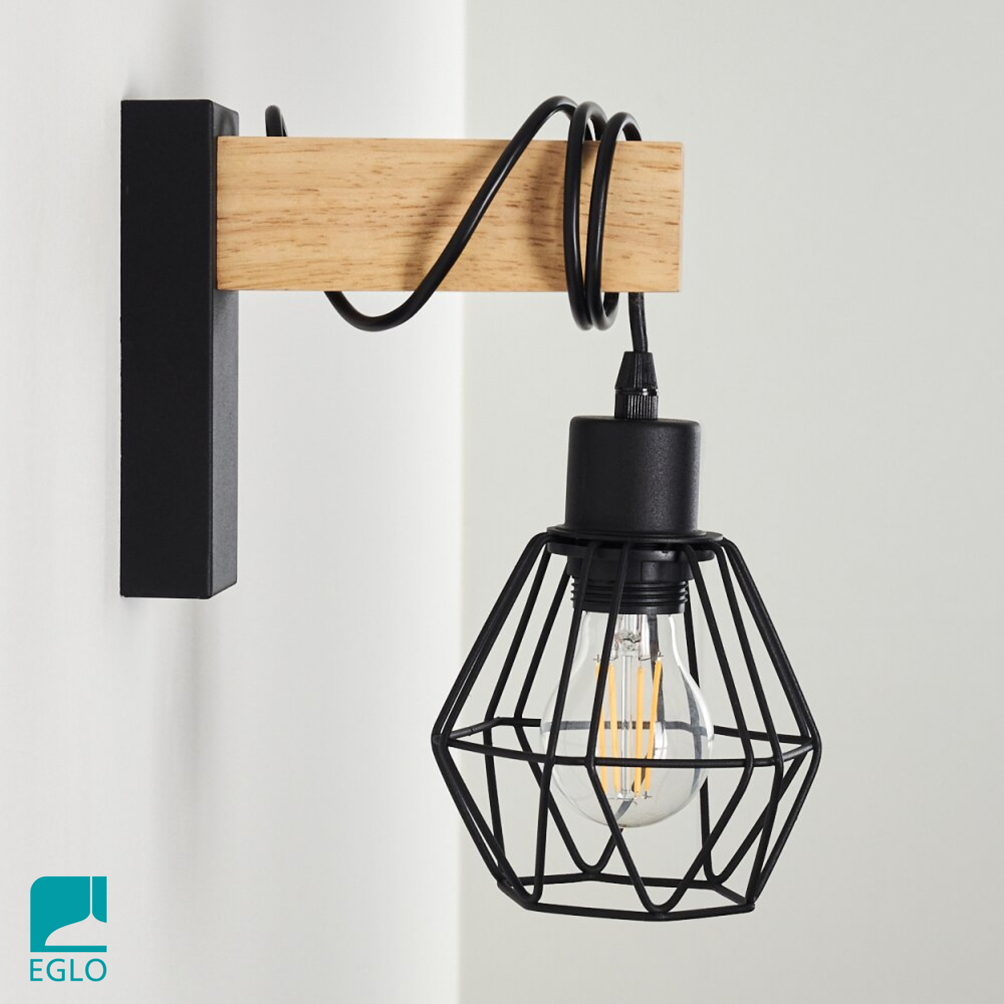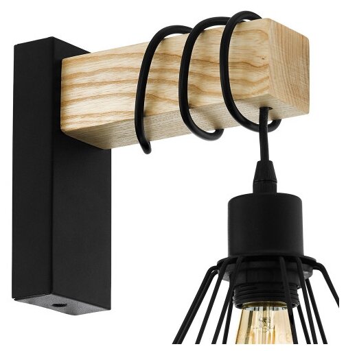 Бра настенный из натурального дерева EGLO Townshend 20, дизайнерский светильник для гостиной, ретро лампа для освещения спальни, прихожей, с черным плафоном и проводом, натуральное дерево, E27, 60 Вт