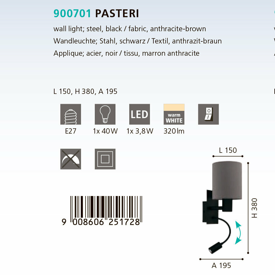 900701 Светильник настенный (бра) c лампой для чтения EGLO Pasteri интересное: