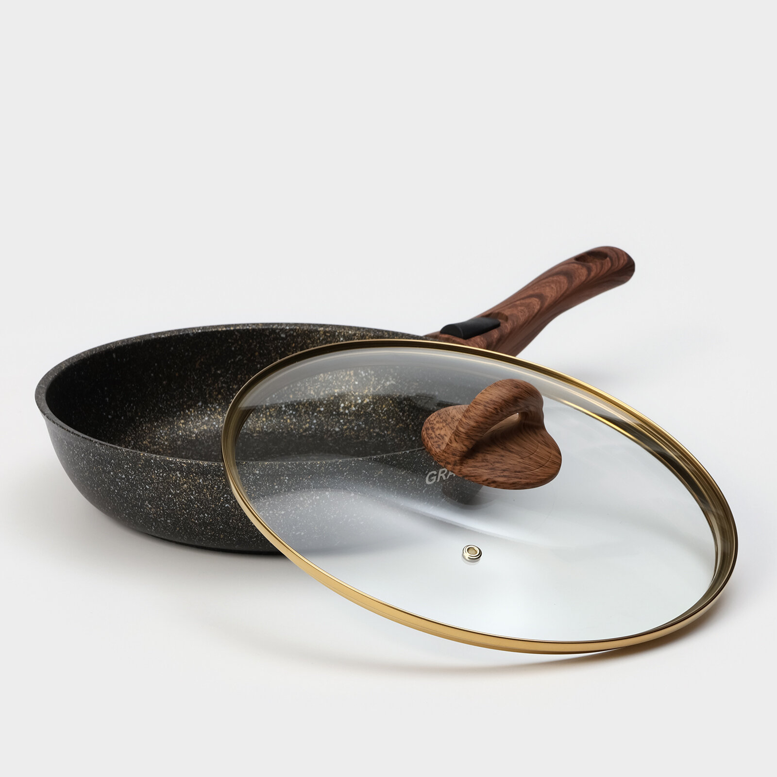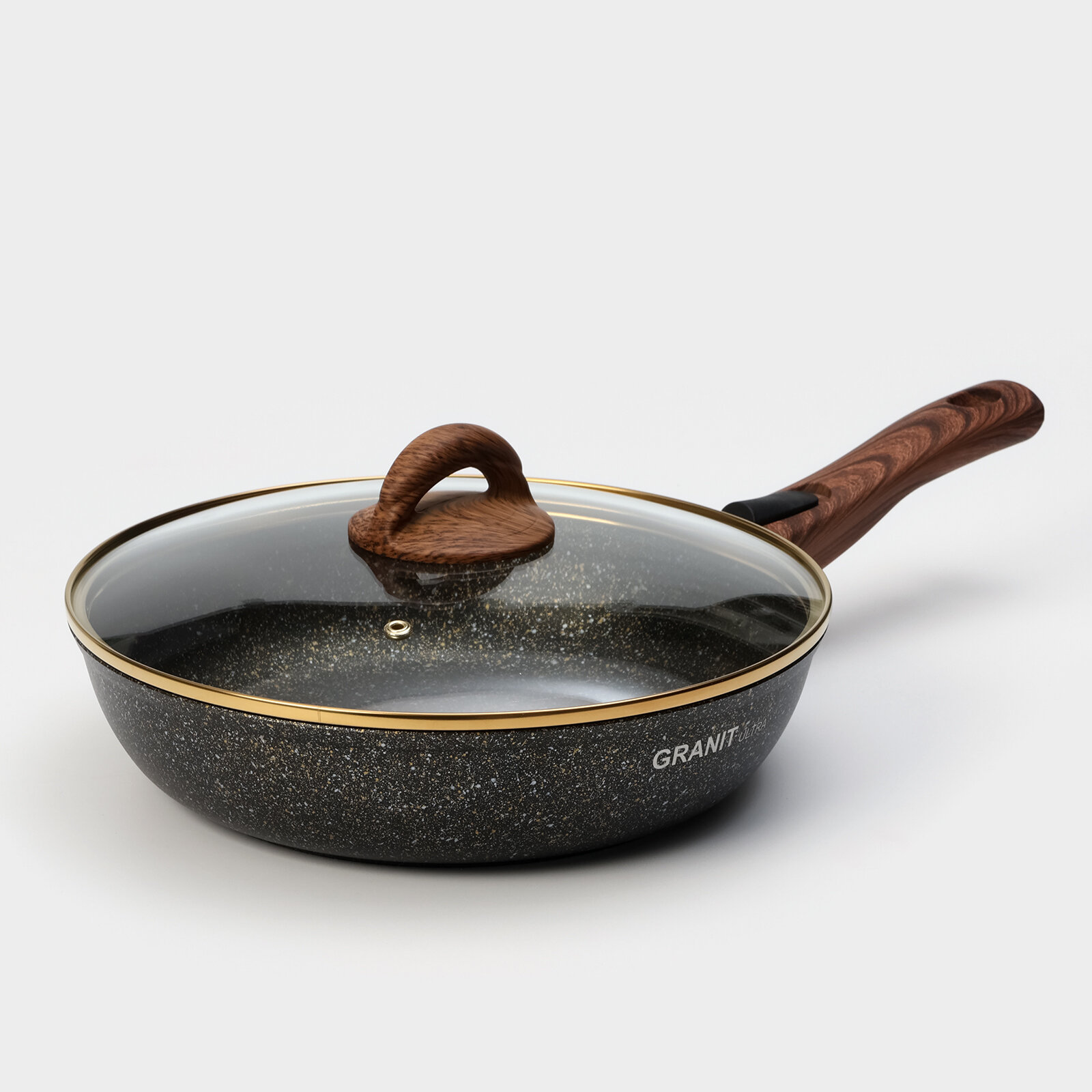 СохранитьСковорода Granit ultra black gold, 26 см, стеклянная крышка, антипригарное покрытие, съёмная ручка K . интересное: