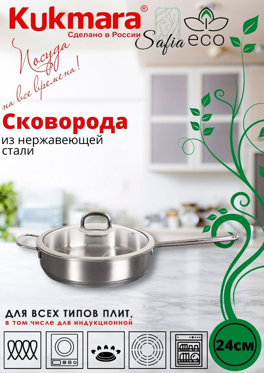 Сотейник из нержавеющей стали 24 см со стеклянной крышкой, линия "Safia" Kukmara