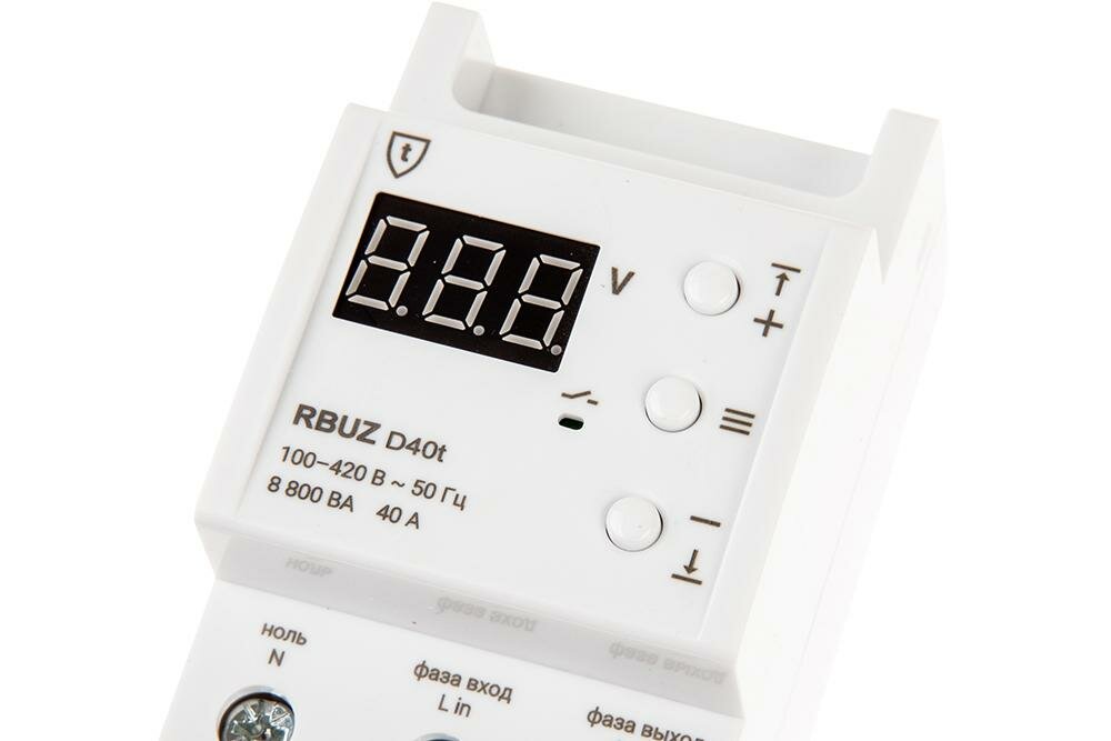 Реле напряжения Rbuz D40t термозащита. 40 А. 8 800 ВА. 100400 В. Настройка времени задержки вкл.