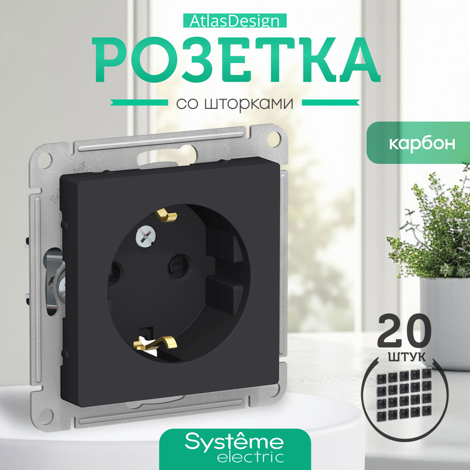 20 шт. Systeme Electric AtlasDesign Карбон, Розетка c заземлением со шторками, 16А, механизм, ATN001045