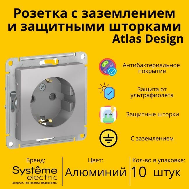 Розетка с заземляющим контактом, со шторками, механизм Монтаж: скрытой установки Цвет: белый Термопласт: антибактериальный, с ионами серебра (Schneider) Systeme Electric AtlasDesign ATN000145 комплект 10шт.