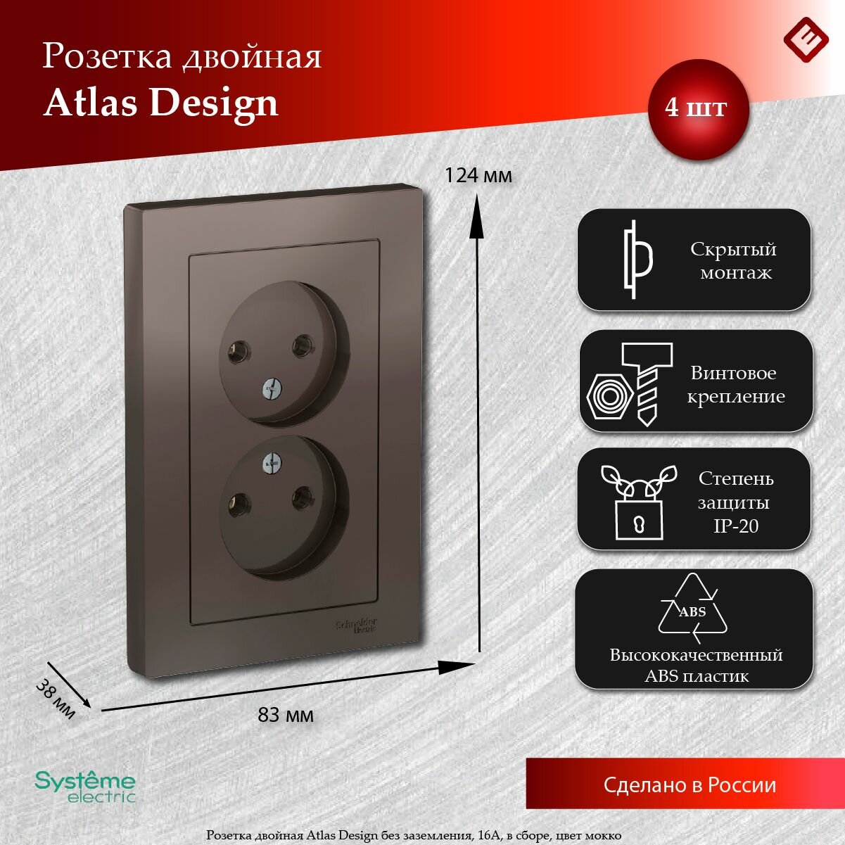 Купить Розетка двойная мокко, без заземления,16А, в сборе, Schneider Electric AtlasDesign (комплект 4шт)