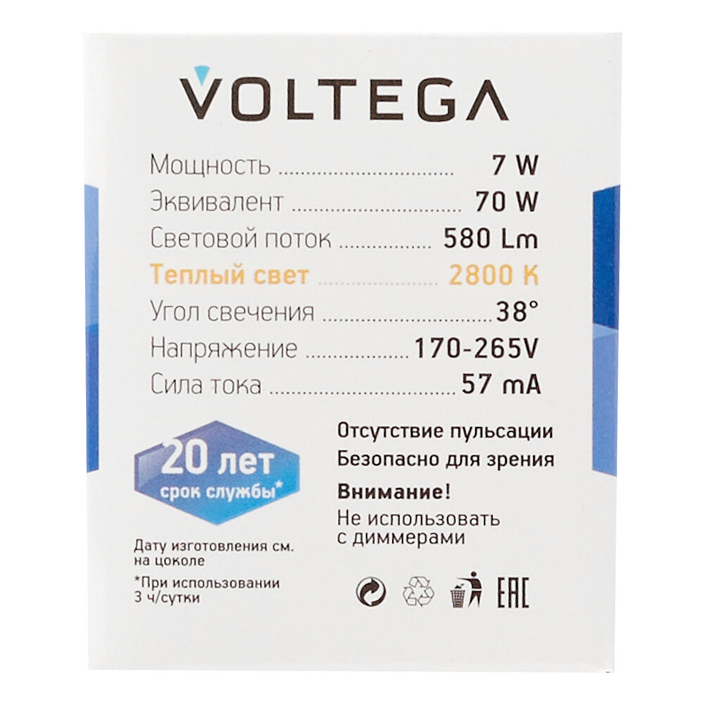Купить Светодиодная лампа Voltega 7056 LED GU10 7W 2800К (теплый белый). Форма колбы лампочки - софит