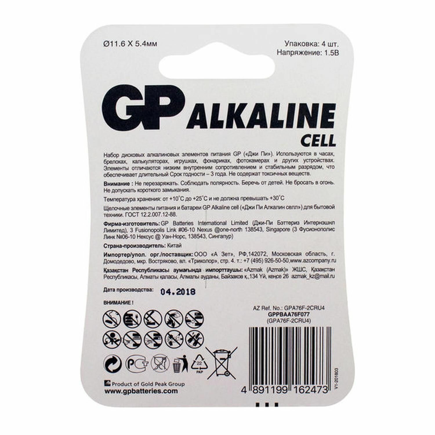 Алкалиновые пуговичные батарейки GP A76 - 4 шт. в блистере