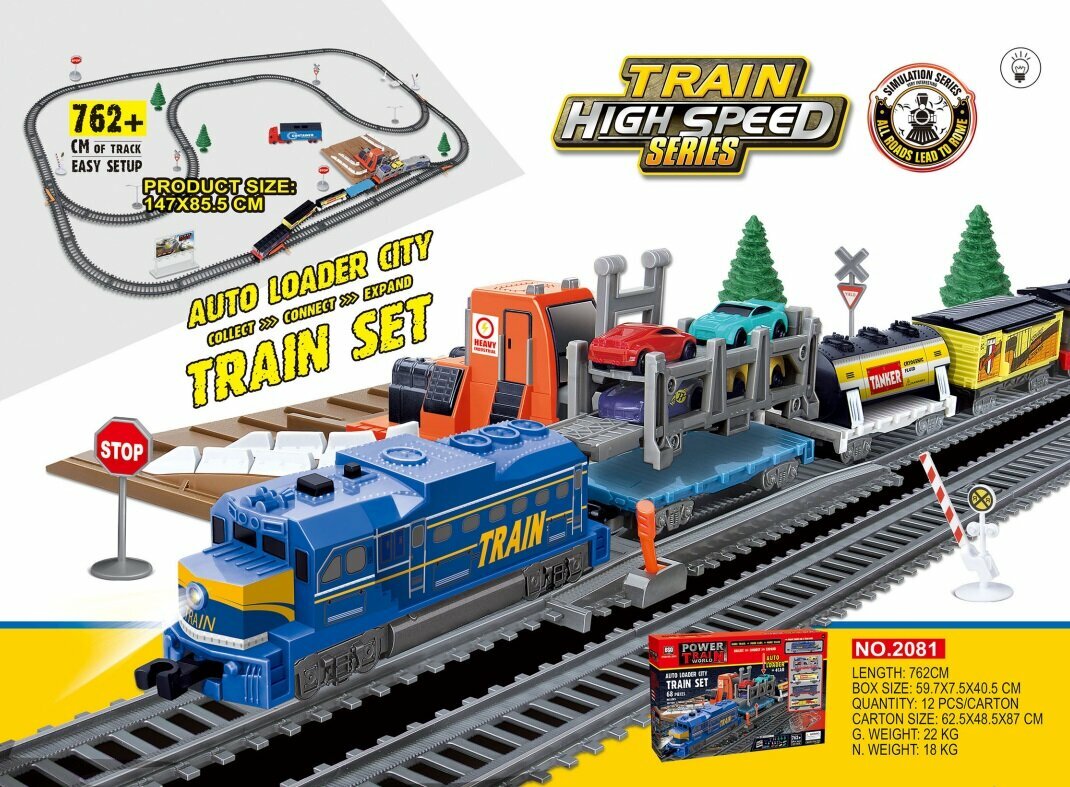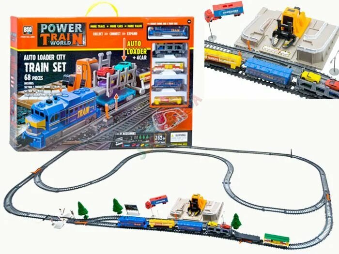 | Подробная комплектация | локомотив, 4 вагона, 2 радиальные стрелки, 2 прямые стрелки, модуль автоматической остановки локомотива, станция погрузки контейнеров и автомобилей, грузовой контейнер, контейнер для перевозки автомобилей, 21 аксессуар, набор рельс |
