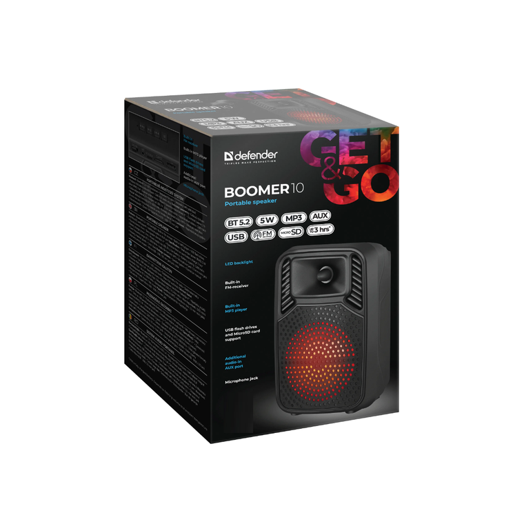 Портативная колонка Defender Boomer 10, 5Вт, 1200мАч, BT, FM, USB, microSD, AUX, подсветка