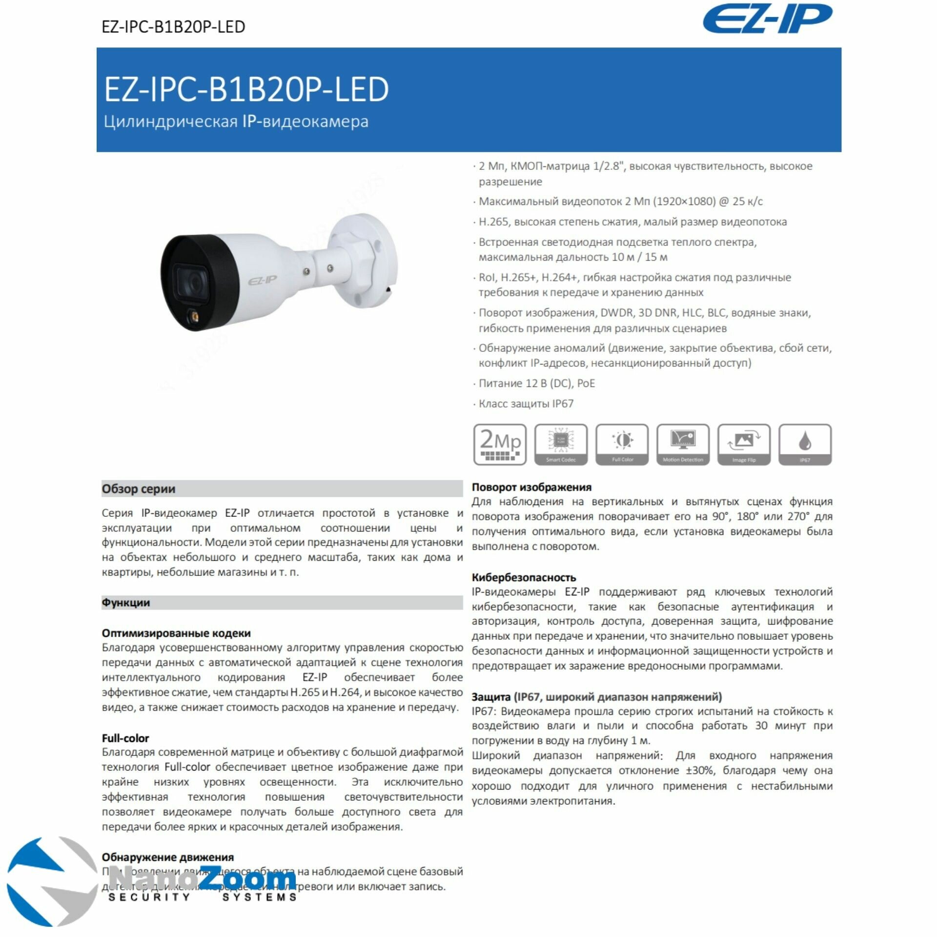 EZ-IP EZ-IPC-B1B20P-LED-0280B 2Мп 2,8 мм камера видеонаблюдения IP уличная, цифровая цилиндрическая IP видеокамера для улицы с ИК/LED-подсветкой, 1920x1080 Full HD, CMOS 1/2.8" интересное: