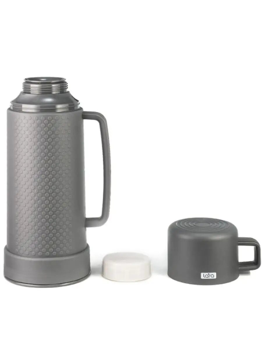 Термос LARA / лара LR04-81 с двойными стенками и ручкой, пластиковый корпус, колба из стекла серый 0.65л / термопосуда