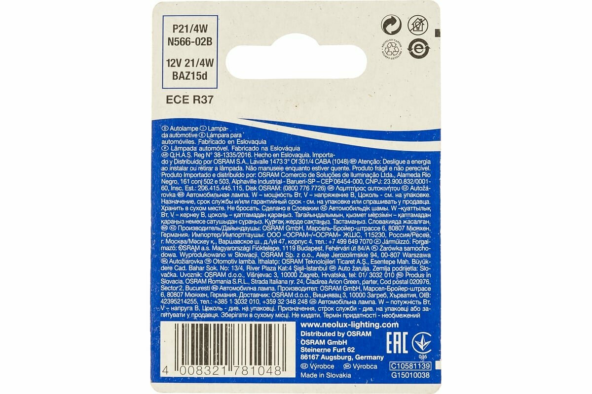 NEOLUX N56602B Лампа P21/4W 12V 21/4W STANDART BAZ15d, блистер 2 шт.