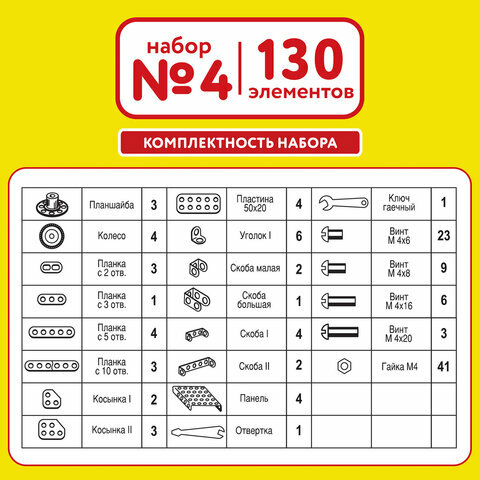 Конструктор металлический юнландия "Для уроков труда №4", развивающий, 130 элементов, 104682 (цена за 1 ед.товара)