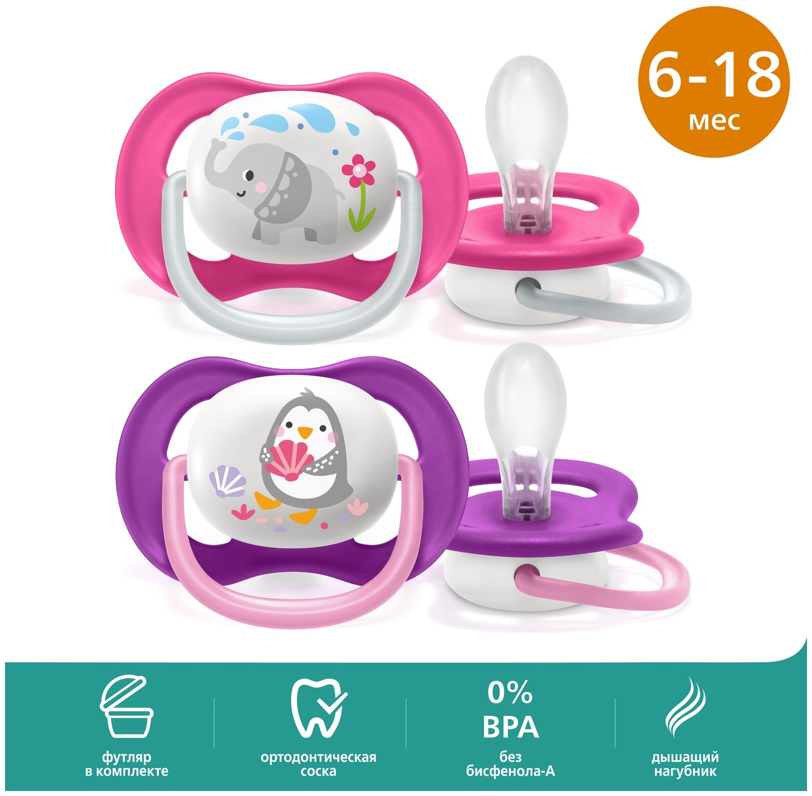 Детский товар Philips Соска-пустышка Avent Слон/Пингвин, 6-18 мес, 2 шт, для девочек