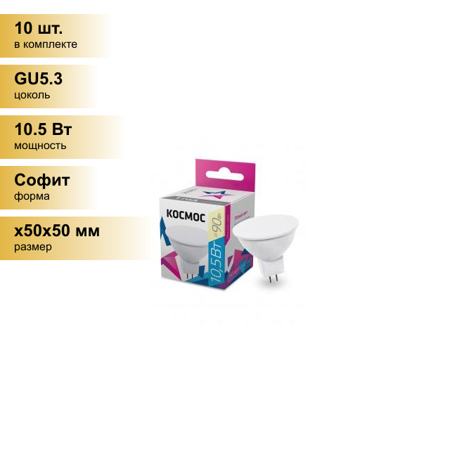 Купить (10 шт.) Светодиодная лампочка Космос MR16 GU5.3 220V 10,5W (10W) (840lm) 3000K 2K матов. 45x50 LkecLED10.5wJCDRC30 . Цоколь GU5.3
