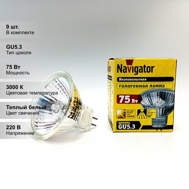 Купить (9 шт.) Галогенная лампочка Navigator PAR, мощность 75 Вт, напряжение питания 220 В, цветовая температура 3000 K, тёплый белый свет, цоколь GU5.3, диммируемая, размер 51х50 мм