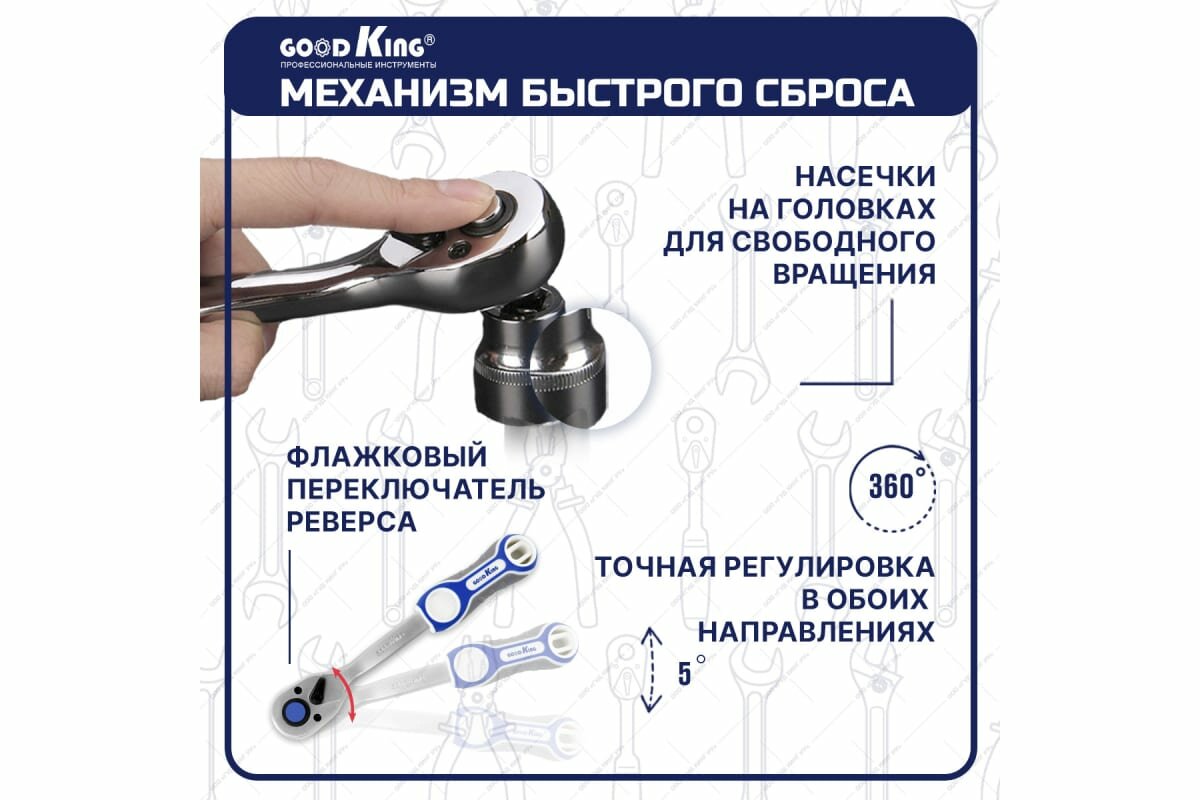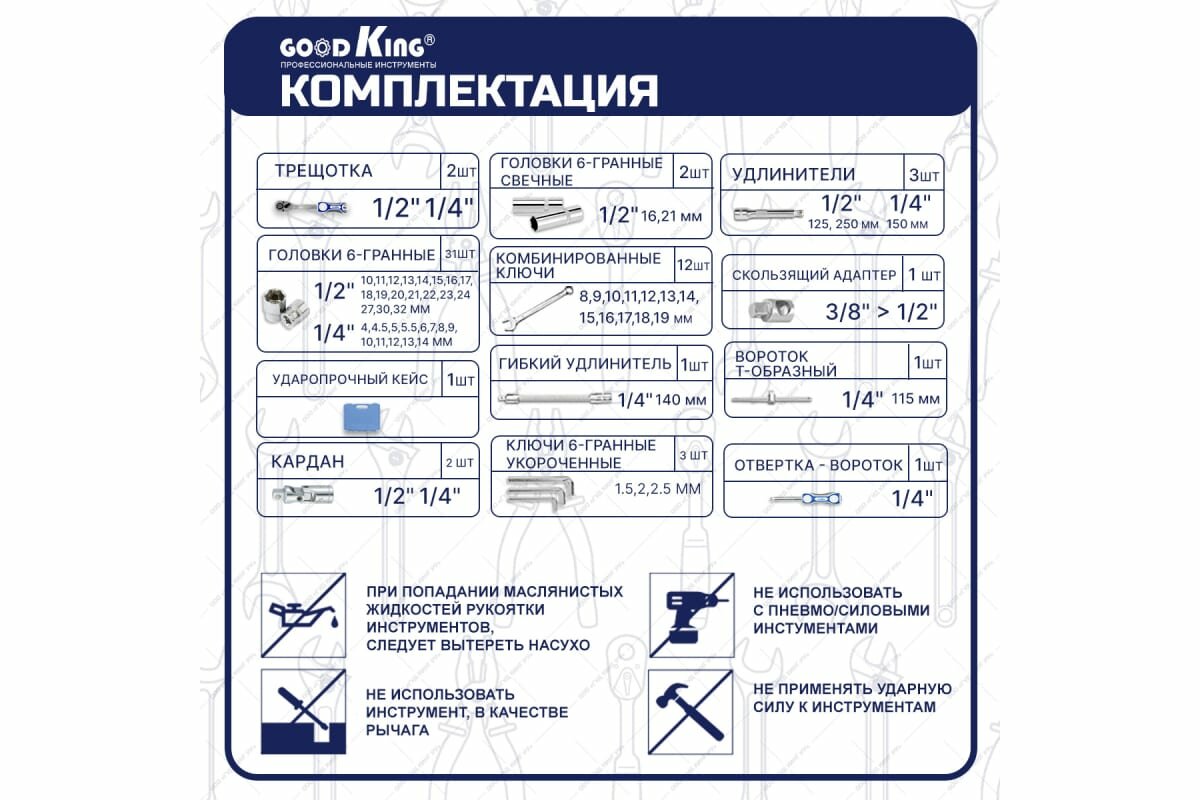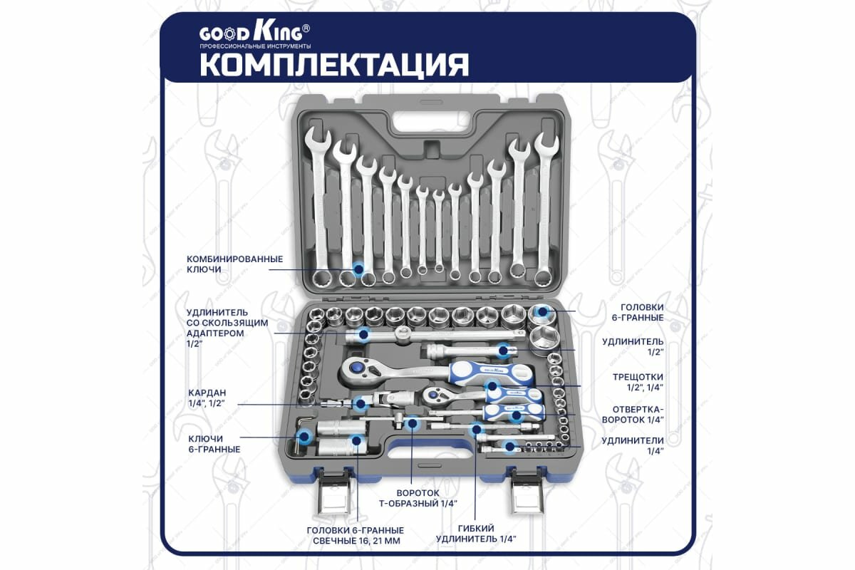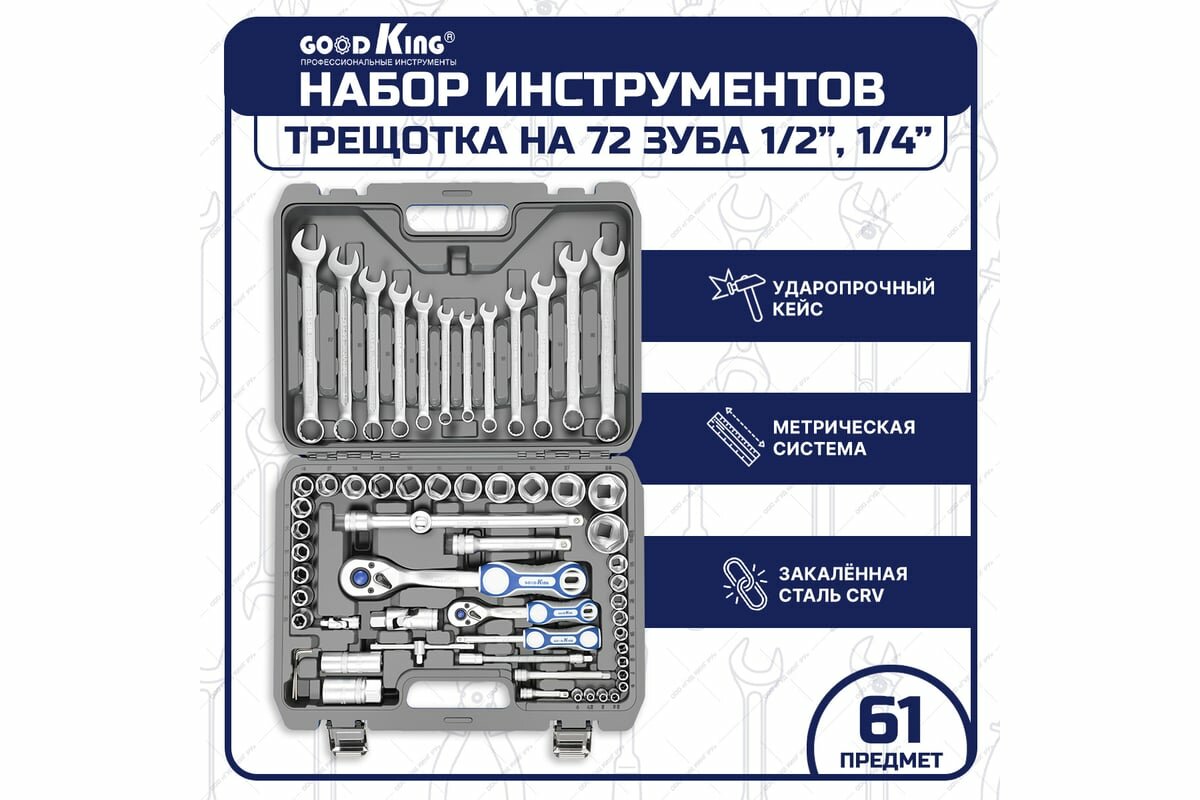 Набор ручных инструментов для авто Goodking B-10061, 61 предмет, трещотка 72 зубца 1/2", 1/4" . интересное: