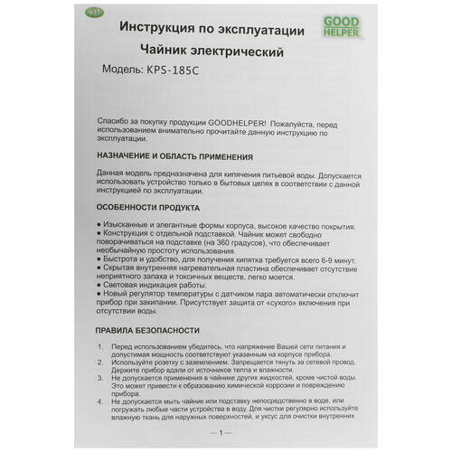Чайник электрический GOODHELPER KPS-185C 1,8л, 1800 Вт, черный