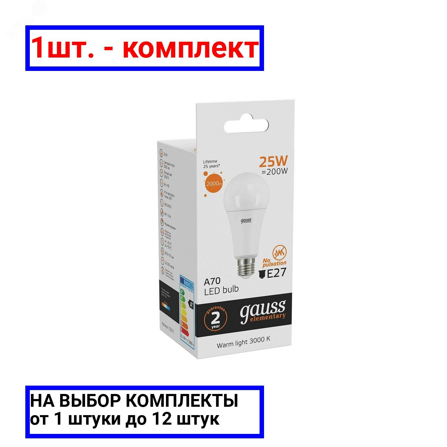 Светодиодная лампа GAUSS Elementary A70 25W 2000lm 3000K E27 LED 1/10/50