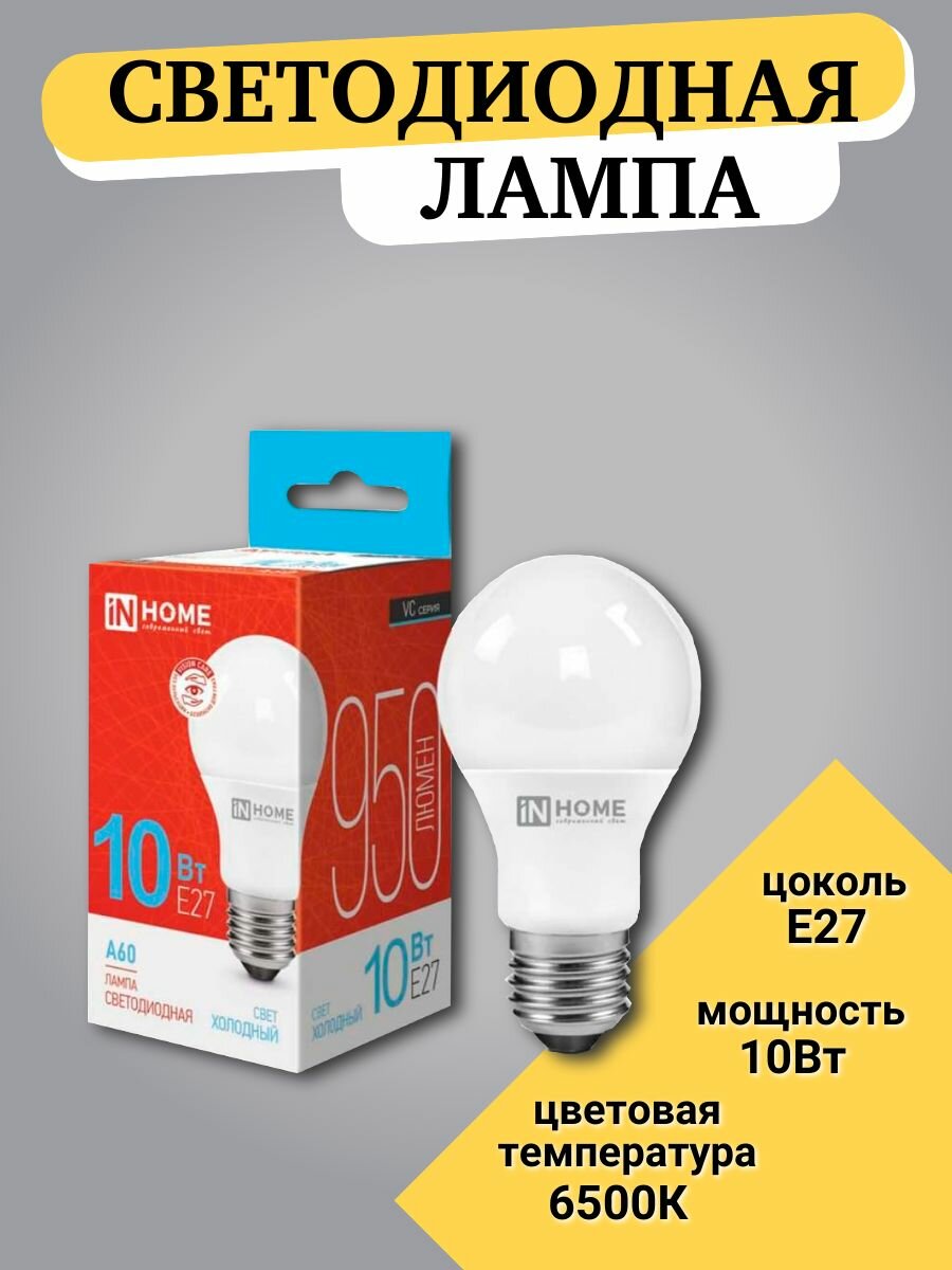 Лампа светодиодная IN HOME LED-A60-VC 4690612020228, E27, A60, 10 Вт, 6500 К