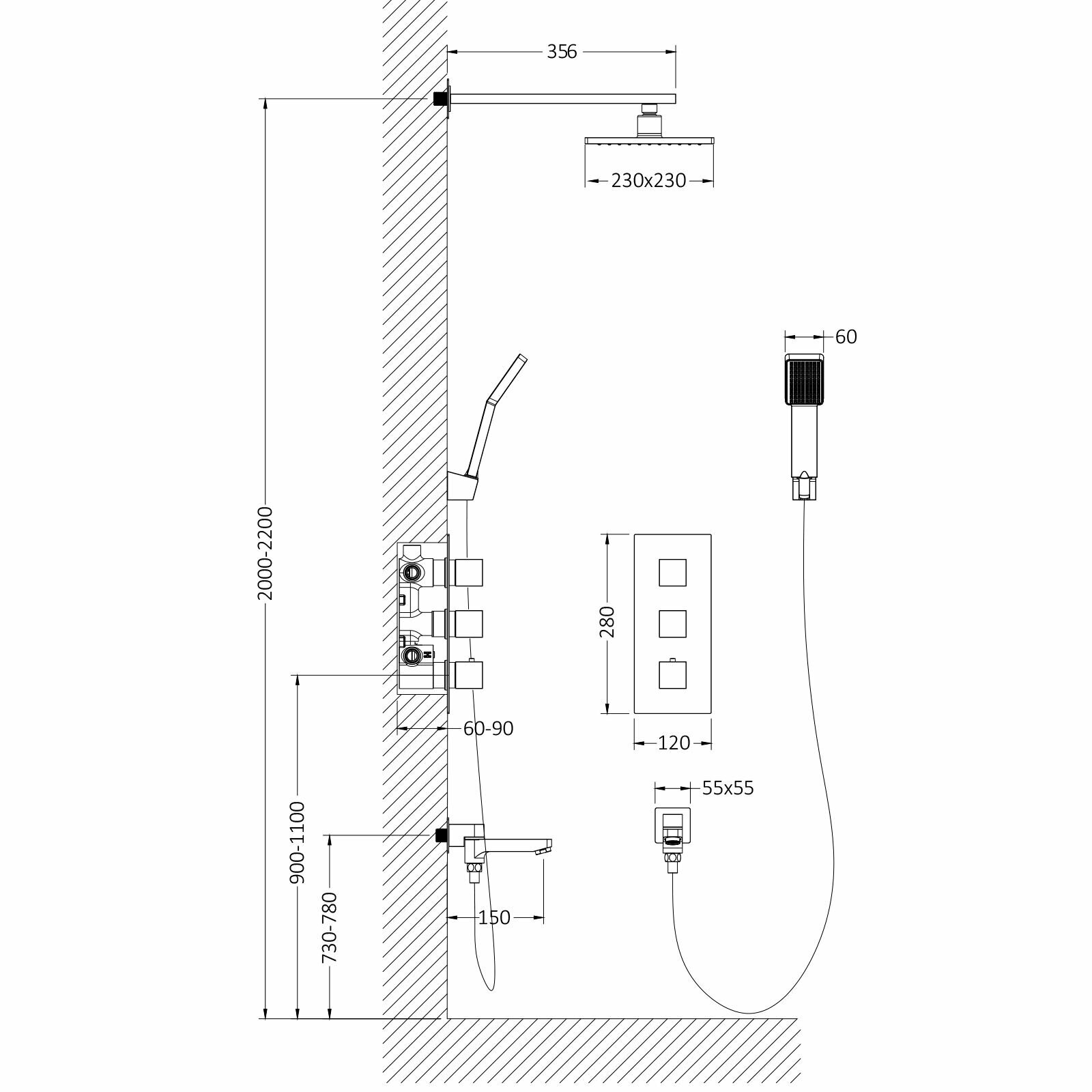 | Комплектация | держатель лейки / тропический душ / декоративная панель / Смеситель / ручная лейка / держатель ручной лейки / шланг для душа / излив / фиксирующее кольцо / ручка термостата / ручка регулирования напора / дивертор |