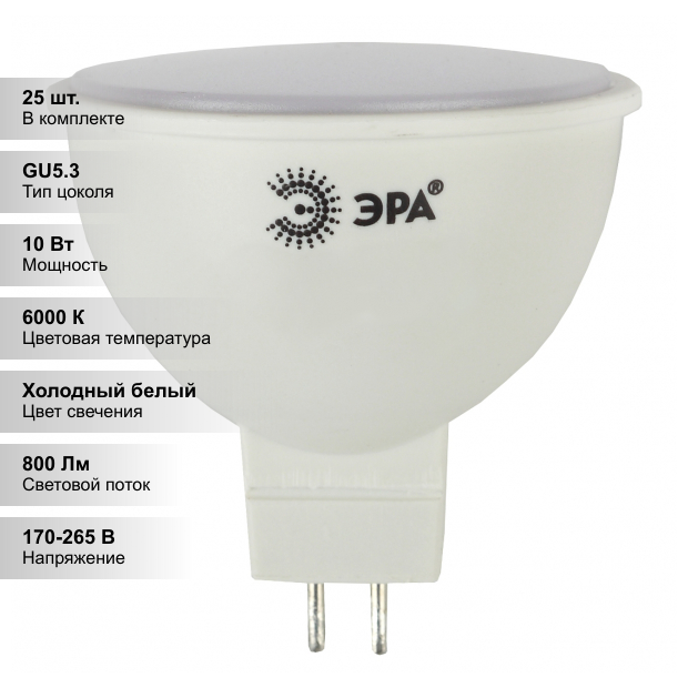 Купить (25 шт.) Светодиодная лампочка ЭРА LED MR16-10W-860-GU5.3
