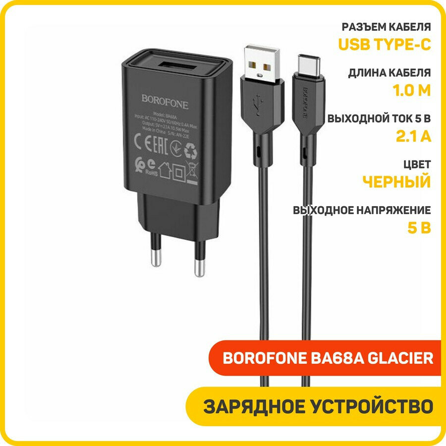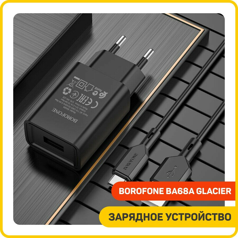 Сетевое зарядное устройство (СЗУ) Borofone BA68A Glacier (USB) + кабель Type-C, 2.1 А, черный