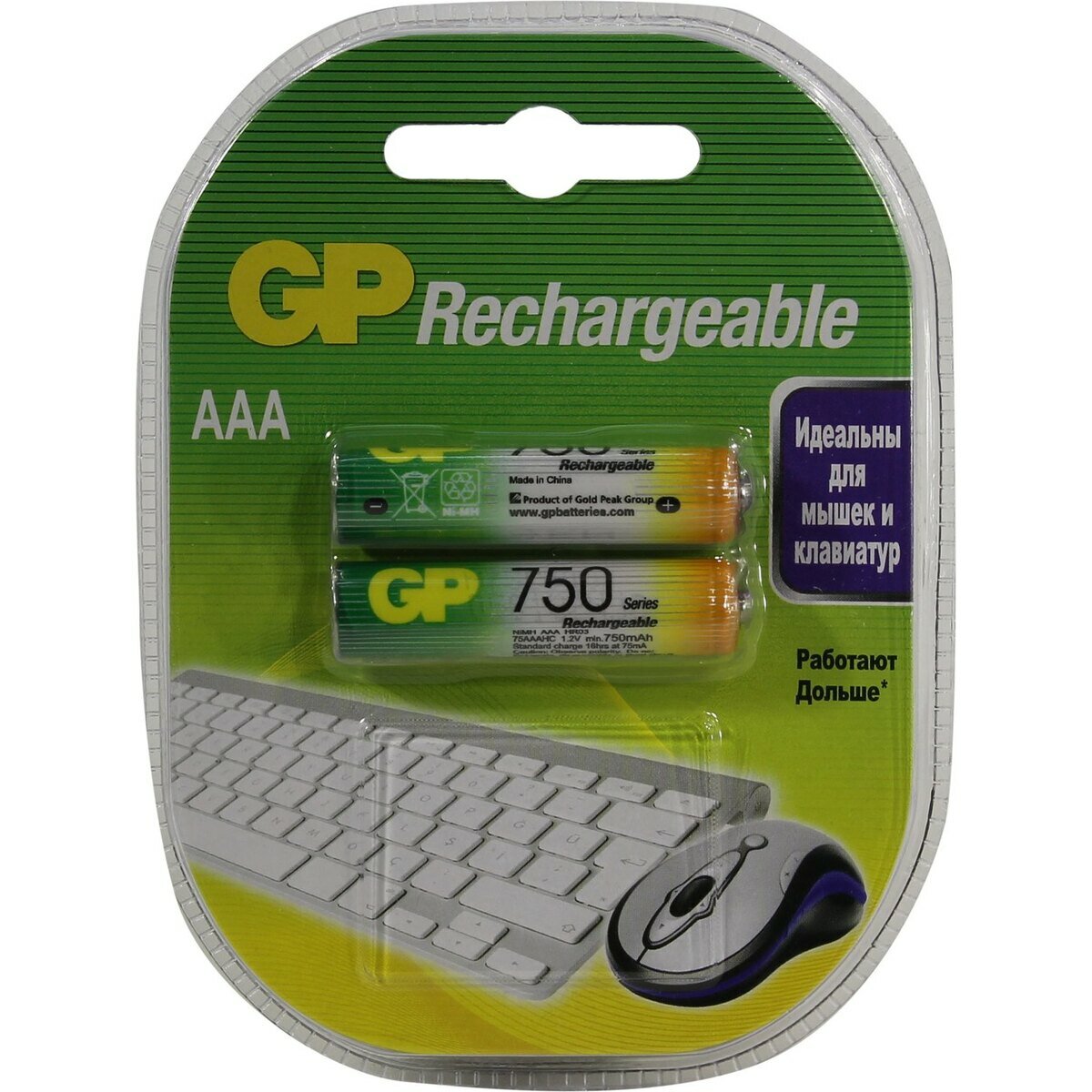 Аккумулятор Ni-Mh 750 мА·ч 1.2 В GP Rechargeable 750 Series AAA, в упаковке: 2 шт.