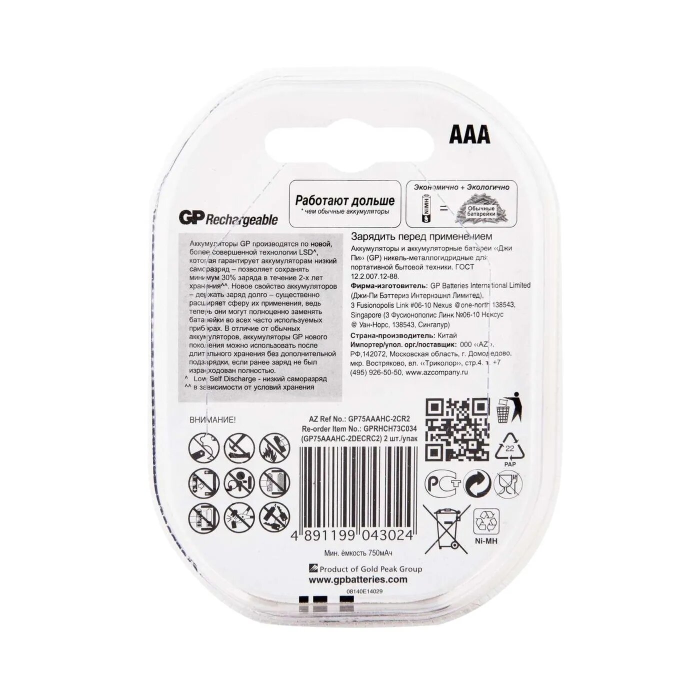 Купить AAA Аккумулятор GP 75AAAHC, 2 шт. 750мAч
