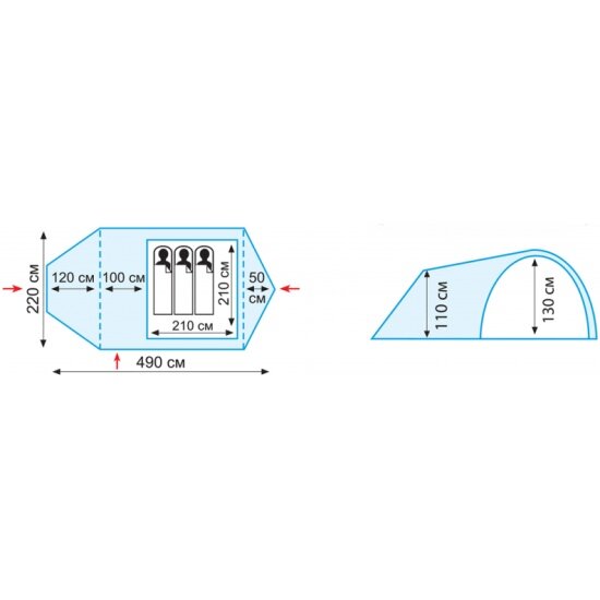 | Габариты внешней палатки(ДxШxВ) | 480x210x130 cм |