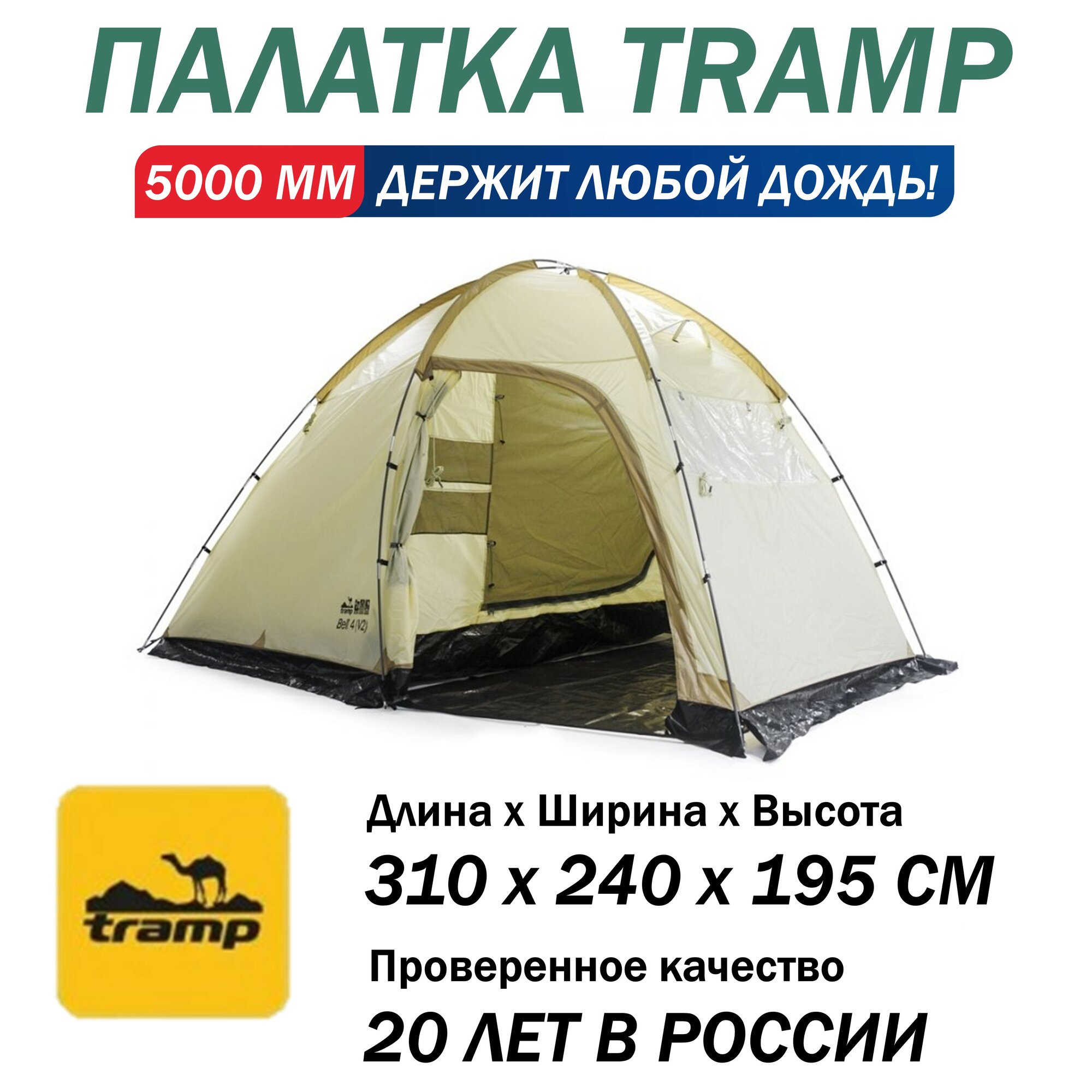 Палатка Tramp «Bell 3 V2», кемпинговая, внешний каркас, двухслойная, 3-местная, 5000/10000 мм, 8.05 кг, песочная